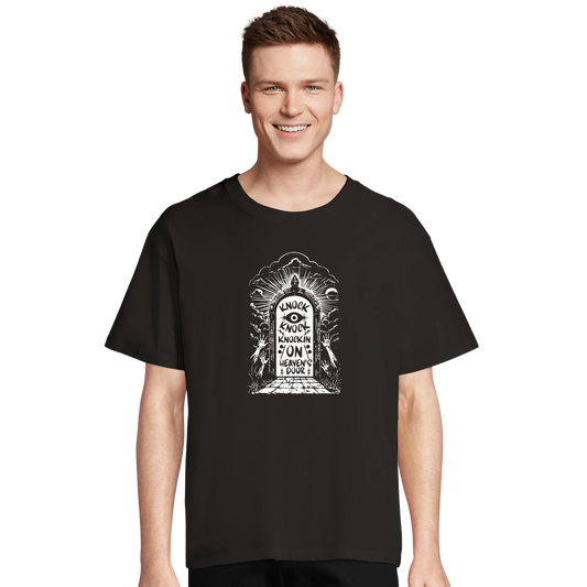 Knock Knock Knockin on Heaven's Door B-0017-B | Unisex Oversized Black T-shirt