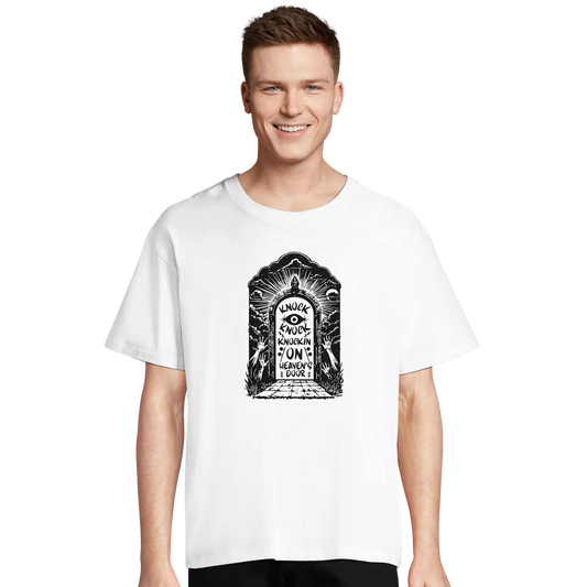 Knock Knock Knockin on Heaven's Door B-0017-W | Unisex Oversized White T-shirt